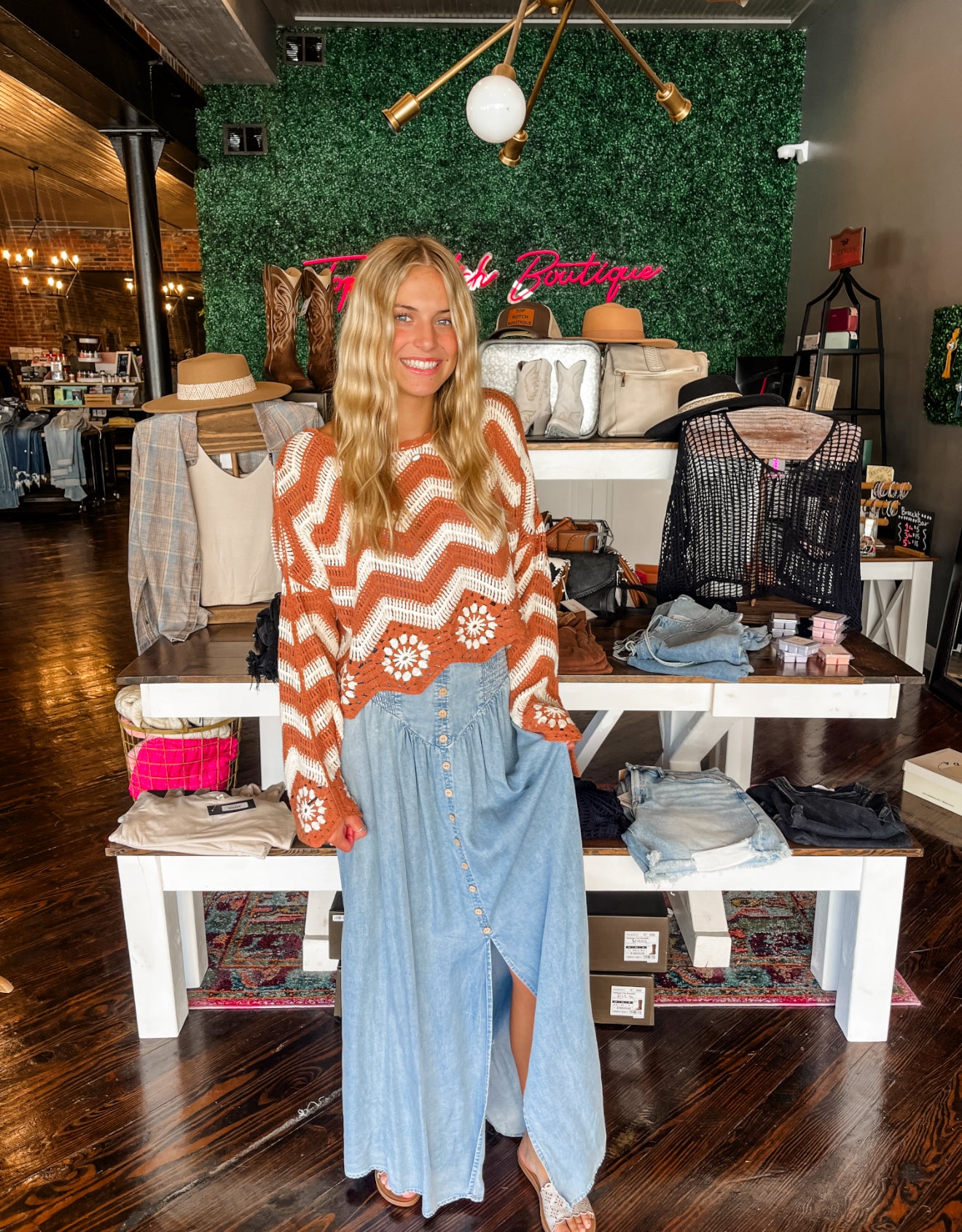 Timeless and versatile — this button-front maxi skirt is the perfect mix of casual and chic. Made from 100% lyocell, it drapes beautifully while still giving you that effortless denim-inspired look. Pair it with a chunky sweater, graphic tee, or fitted tank — it’s a year-round staple.