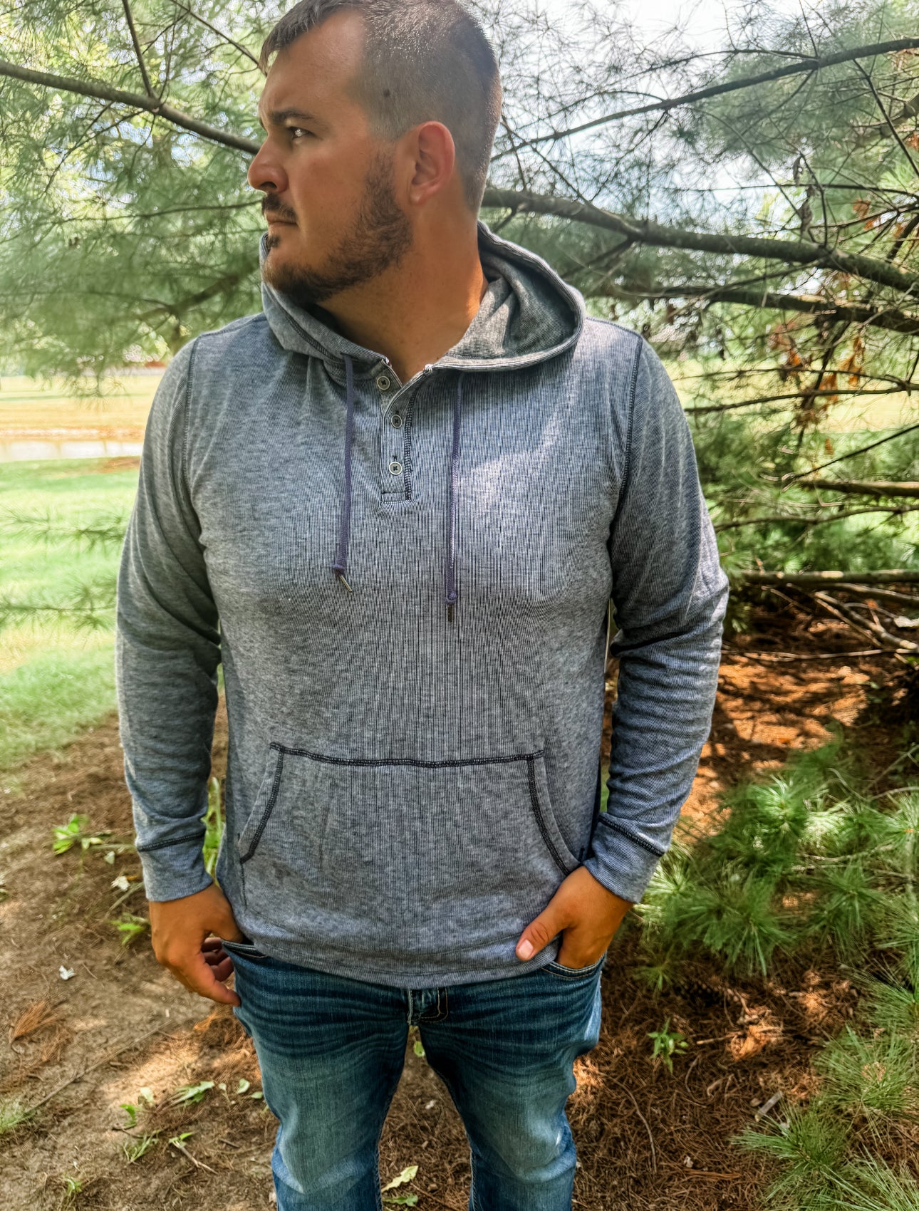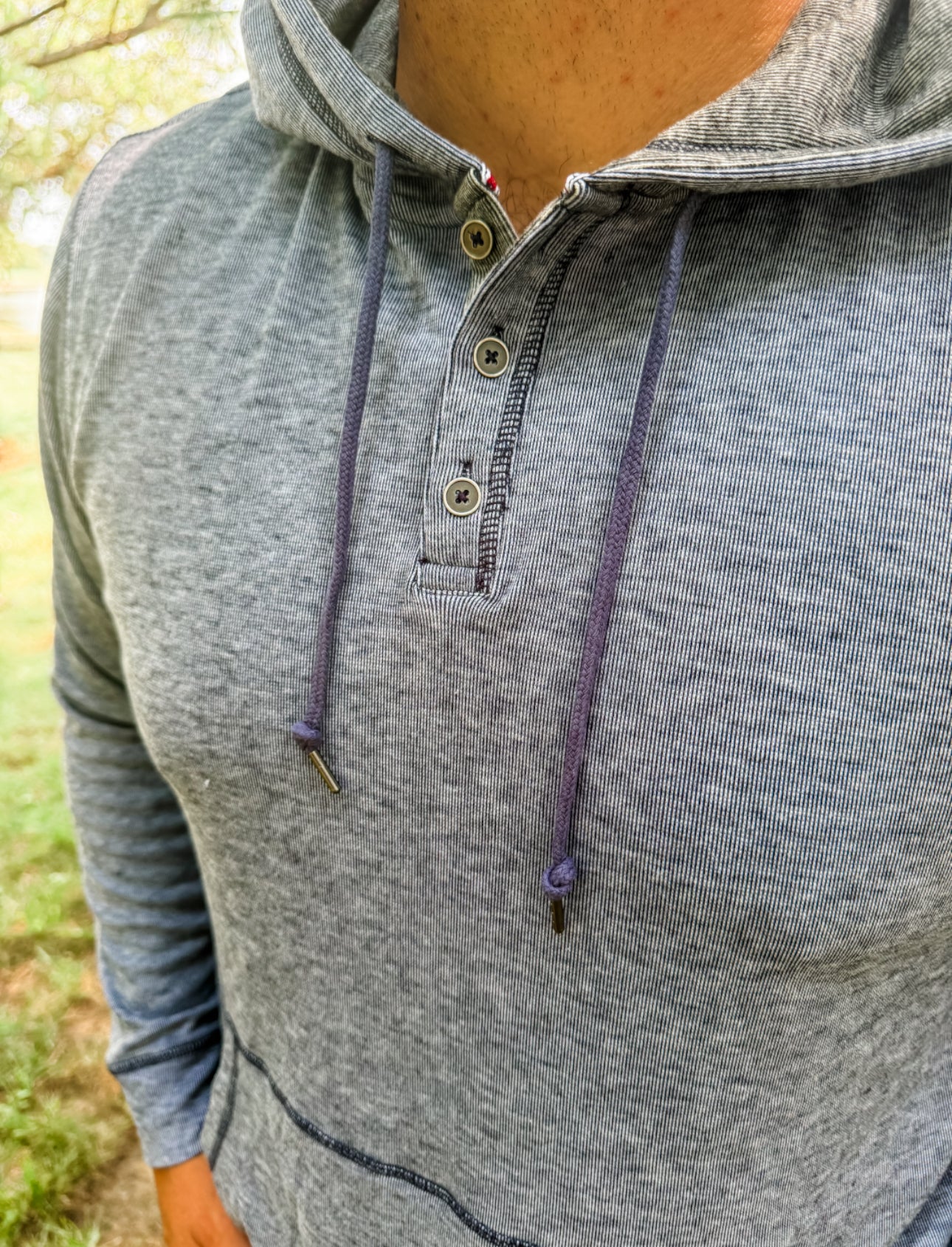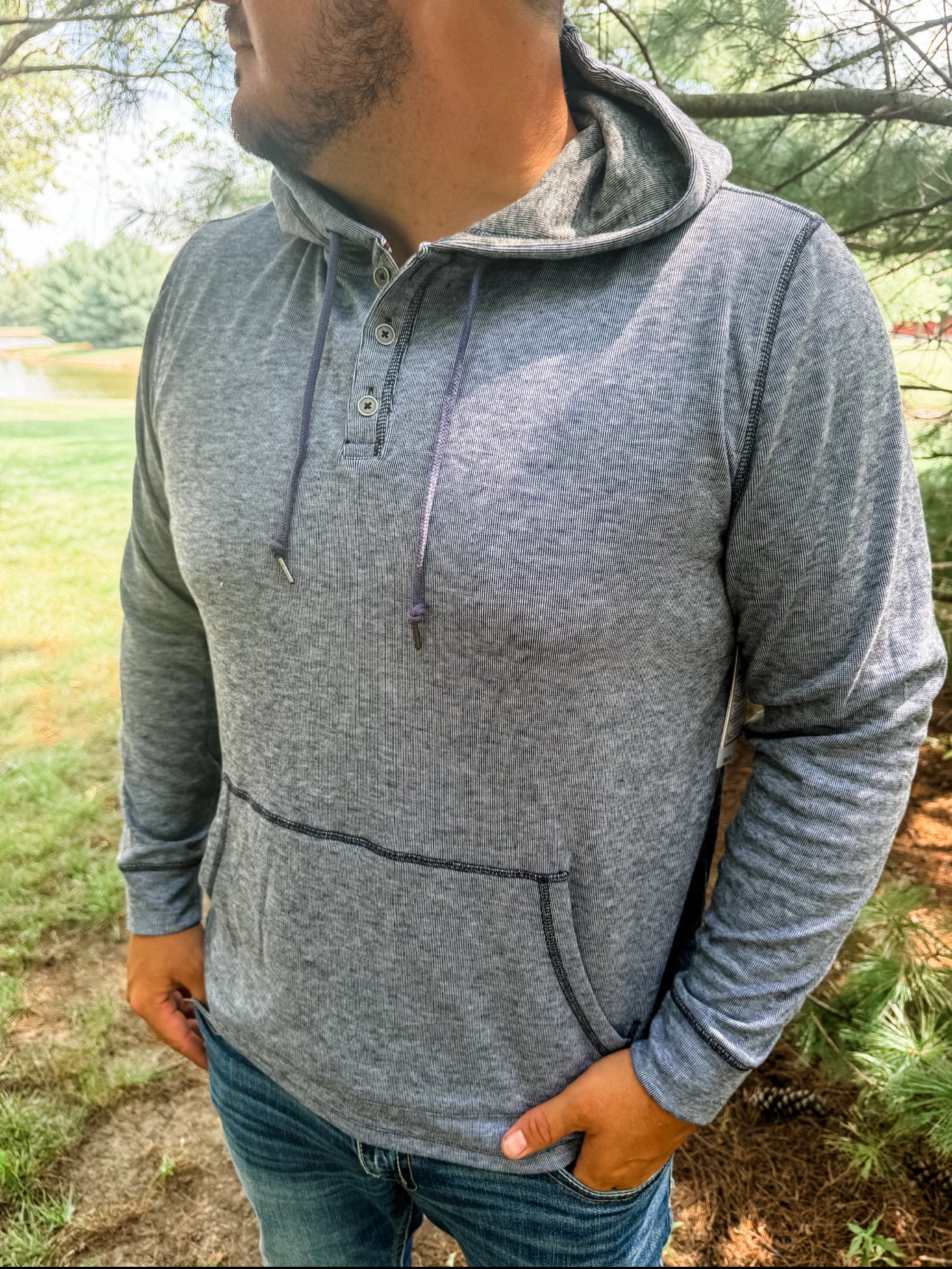 - Textured Stretch Hooded Henley in their rotation. Made from a special blend of ultra-soft fabrics with built-in stretch for maximum mobility, it’s the perfect balance of all-day comfort and casual everyday style. Three-button front placket; adjustable drawstring hood. Functional kangaroo front pocket.