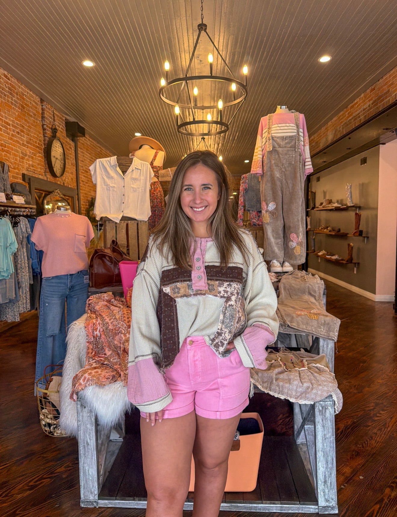 The POL Patterned Thermal Top features a soft waffle-knit base mixed with contrast patchwork panels, raw edge details, and a relaxed Henley neckline for that effortlessly worn-in look we love. The mix of textures and muted tones makes it a standout while still being easy to style.