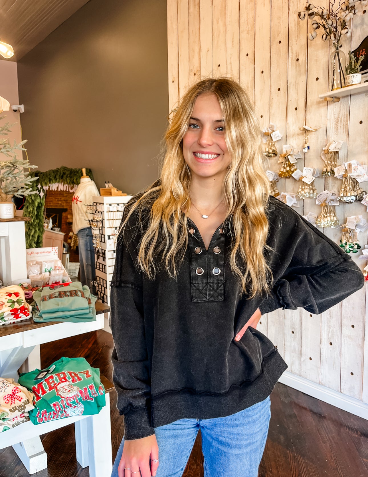 Meet your new everyday go-to — this washed pullover has that perfectly broken-in feel you love with a little bit of edge. The grommet-detail neckline brings a sporty, boutique vibe, while the relaxed fit keeps it effortlessly comfy. Throw it on with jeans, leggings, or layer it up — it always looks cute.