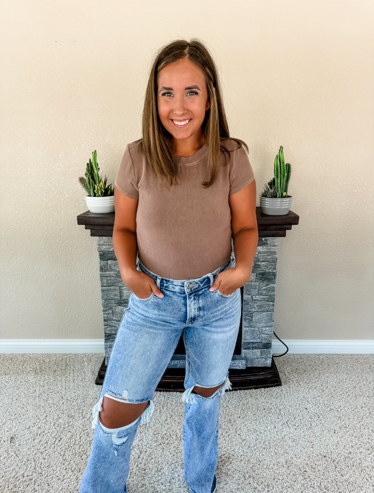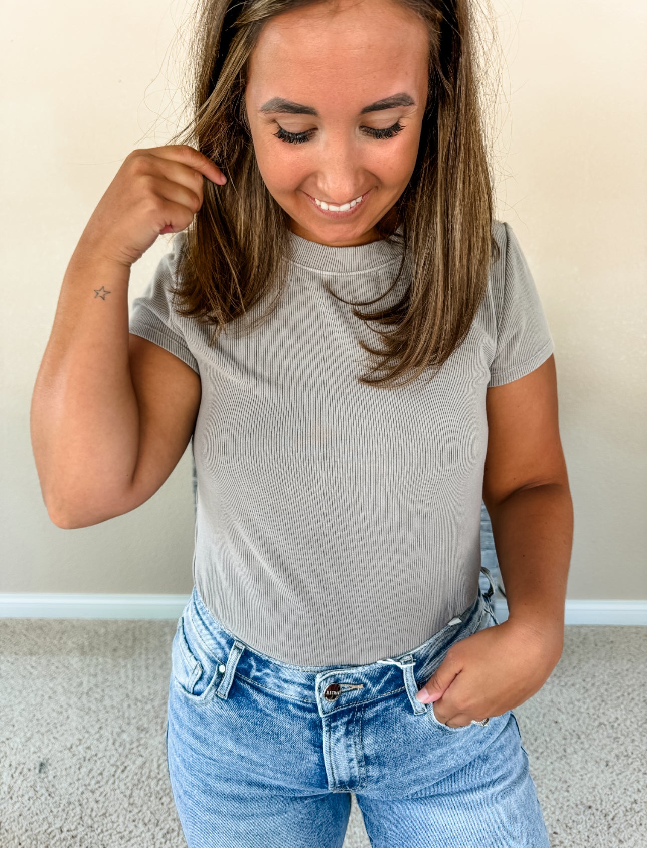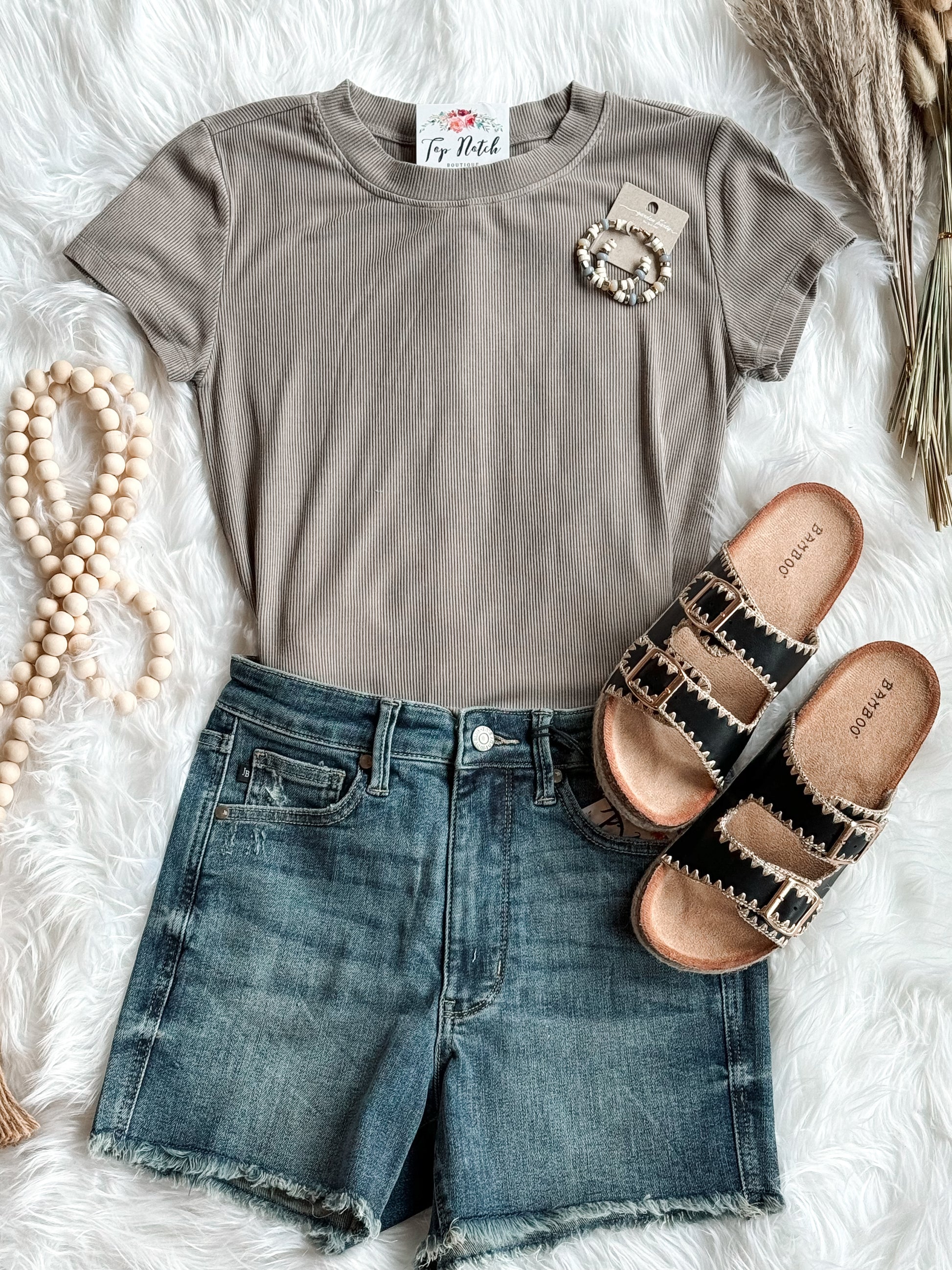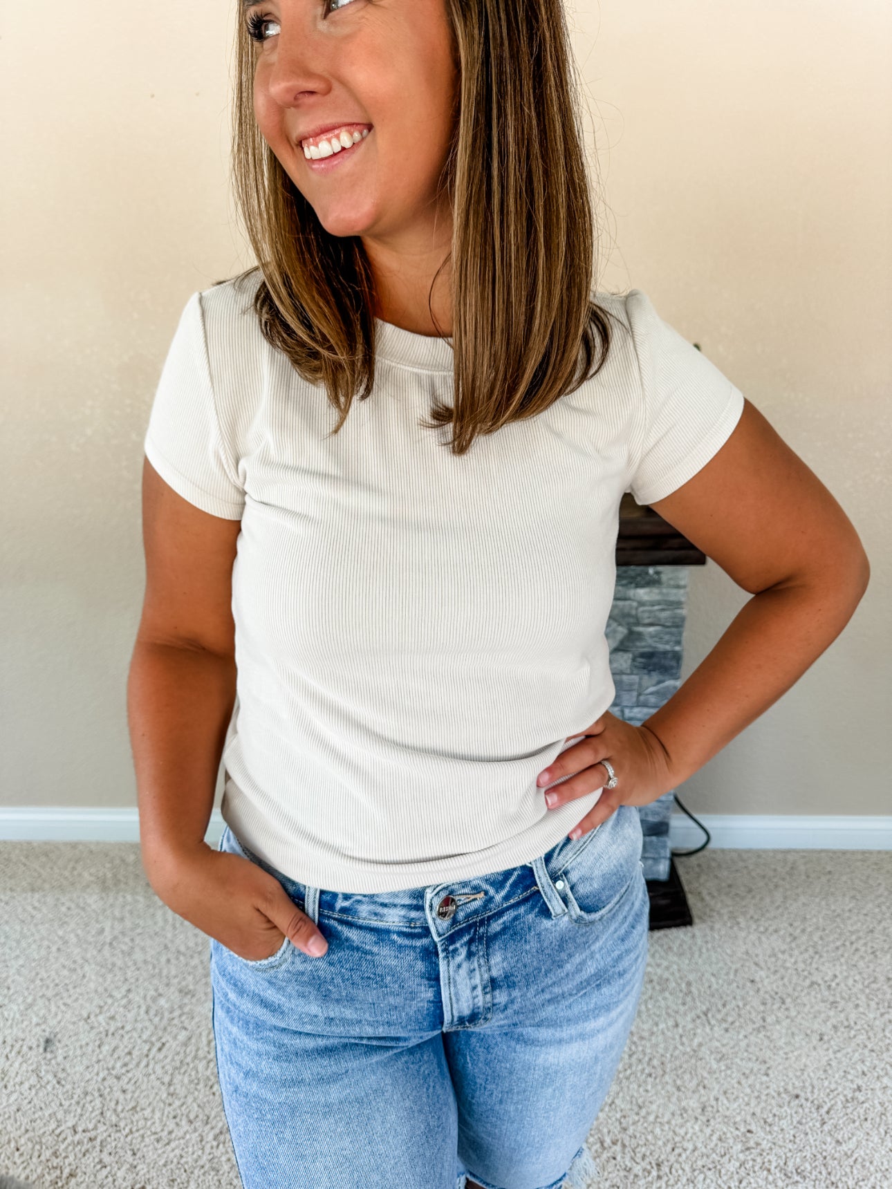The Classic Ribbed Tee: your new go-to for any occasion. This basic tee is perfect for layering or dressing up or down, making it a versatile addition to your wardrobe. Don't miss out on this timeless style (pun intended)!