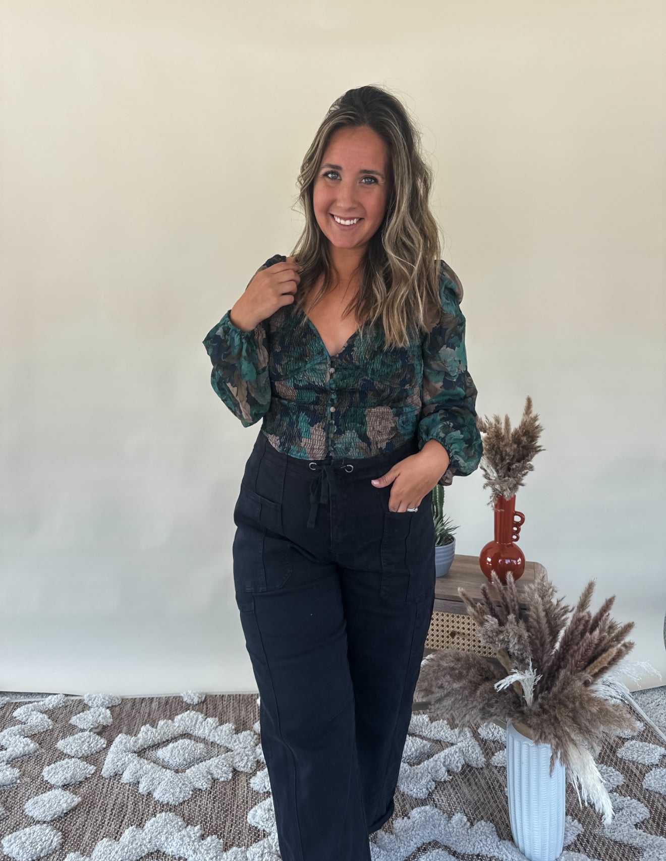 The True Blue Retro Top features a smocked bodice, soft flowy sleeves, and a flattering sweetheart neckline — giving major vintage-inspired vibes. With a mix of deep teal, forest green, and earthy neutrals, it’s the perfect piece for dressing up jeans or pairing with trousers for a night out.