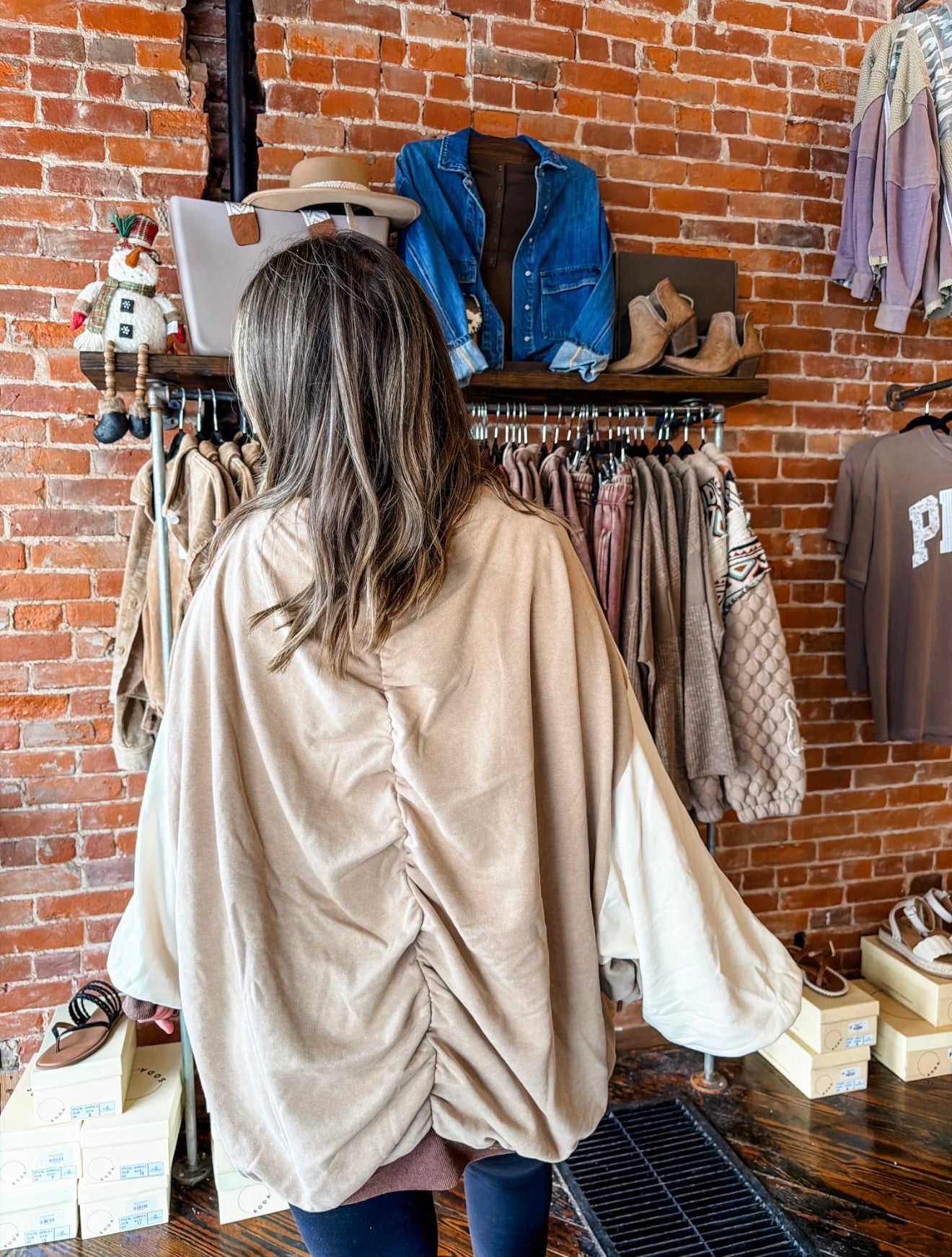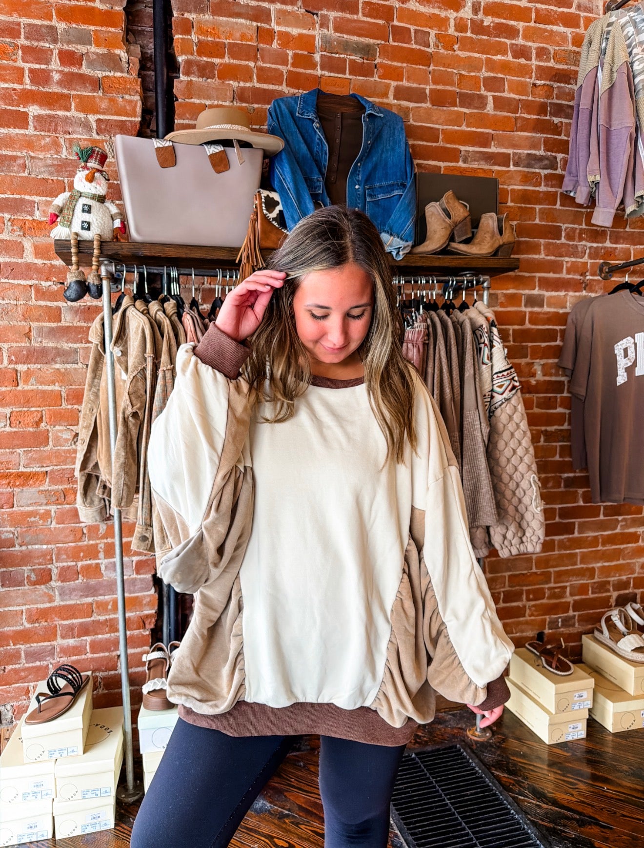 The neutral you’ll never get tired of. The Aspen Colorblock Crew combines shades of cream, taupe, and mocha in the softest cotton-blend fabric for that lived-in, comfy feel. With its balloon-style sleeves and relaxed silhouette, this sweatshirt gives everyday casual a chic upgrade — perfect for layering with denim or leggings.