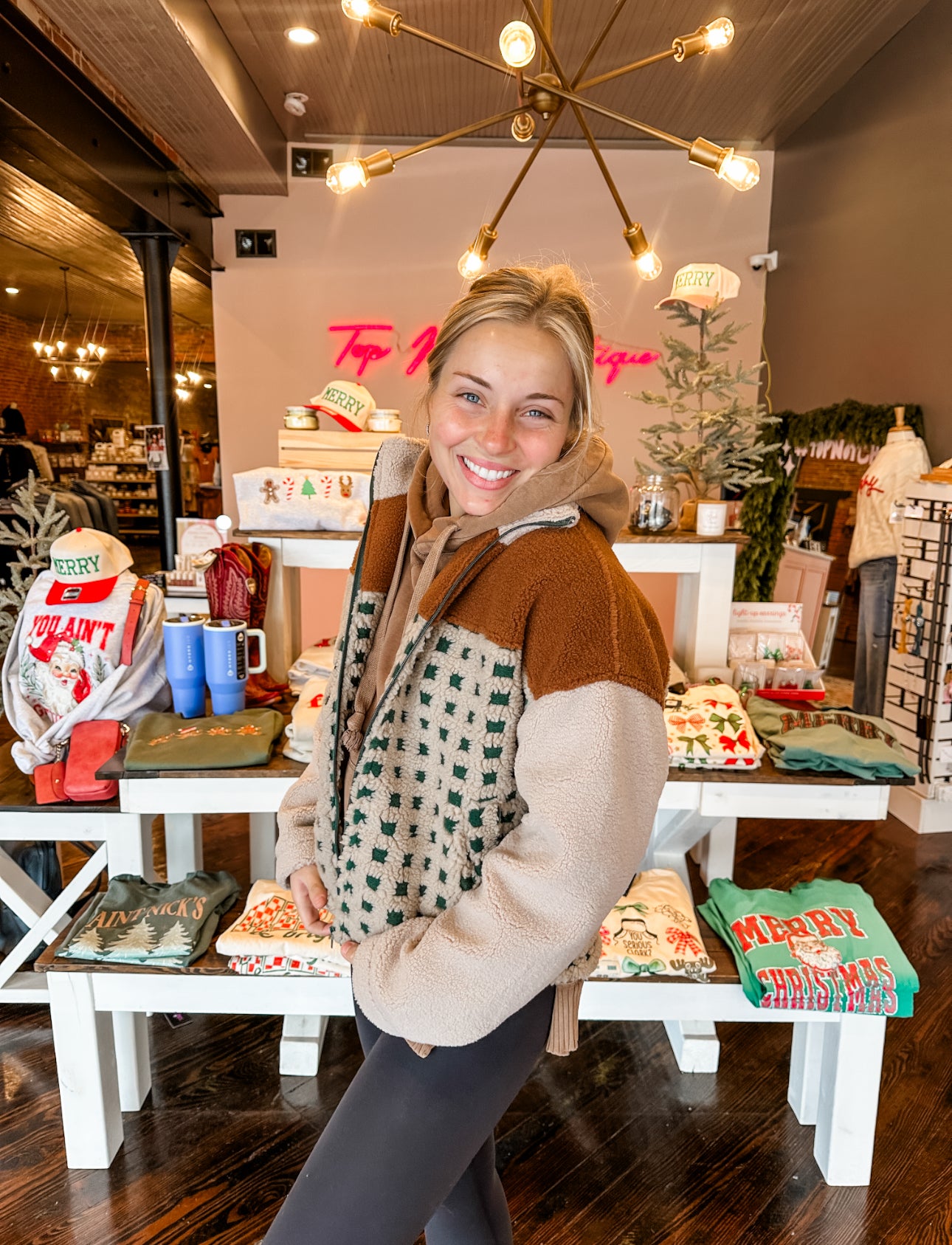 Featuring mixed sherpa textures with a check pattern front and soft contrast sleeves, this jacket gives you that boutique look without sacrificing comfort. It’s warm, lightweight, and perfect for layering over hoodies, long sleeves, or sweaters.