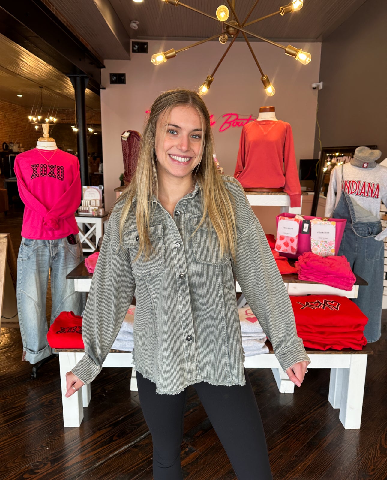Meet your new go-to layering piece. The Evergreen Corduroy Button-Down Shacket features a soft, lightweight corduroy fabric with a relaxed fit that’s perfect for tossing on over tanks, tees, or sweaters. Designed with functional chest pockets, a classic button front, and raw edge detailing at the hem for that perfectly lived-in look. Easy to dress up or down—this one will be on repeat all season long.