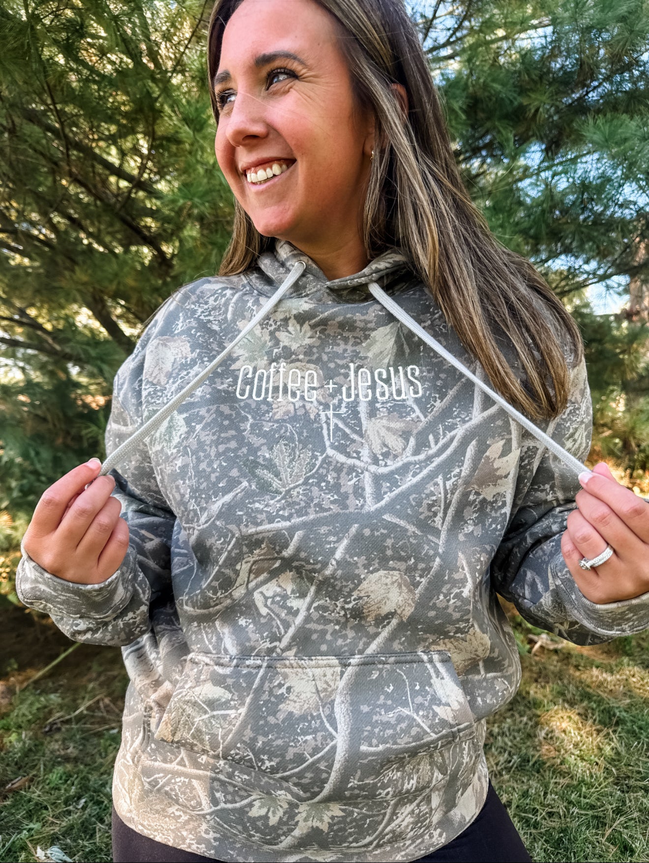 Our Deadwood Camo Hoodie by Independent blends that outdoorsy vibe you love with a cozy, faith-filled twist — featuring our in-house embroidered “coffee + Jesus” design stitched right here at Top Notch.