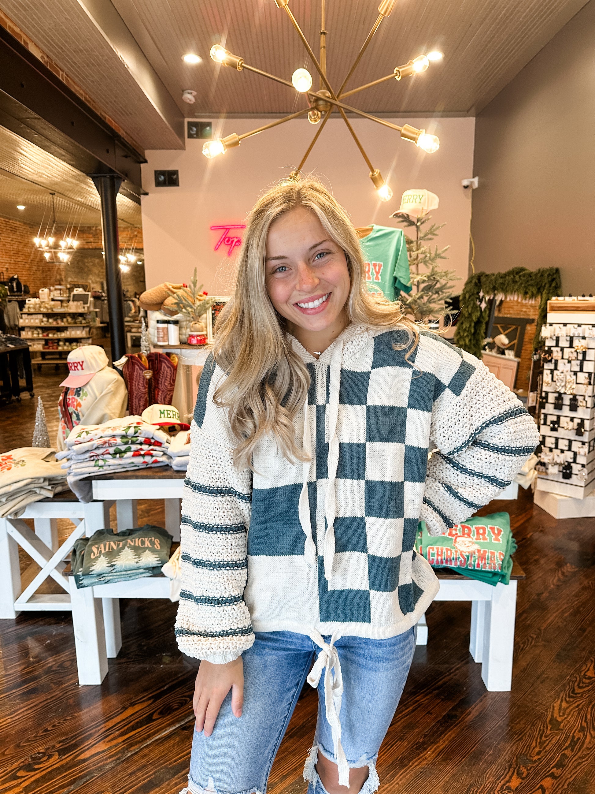 Cozy, unique, and full of textured charm — the Forest Haze Hoodie by Mello is a statement knit you’ll love all season long. This lightweight 100% polyester hoodie features a bold forest-green checker pattern paired with striped sleeves for the perfect mix of playful and effortless. The drawstring hem adds a customizable fit, while the relaxed silhouette keeps it comfy for everyday wear.