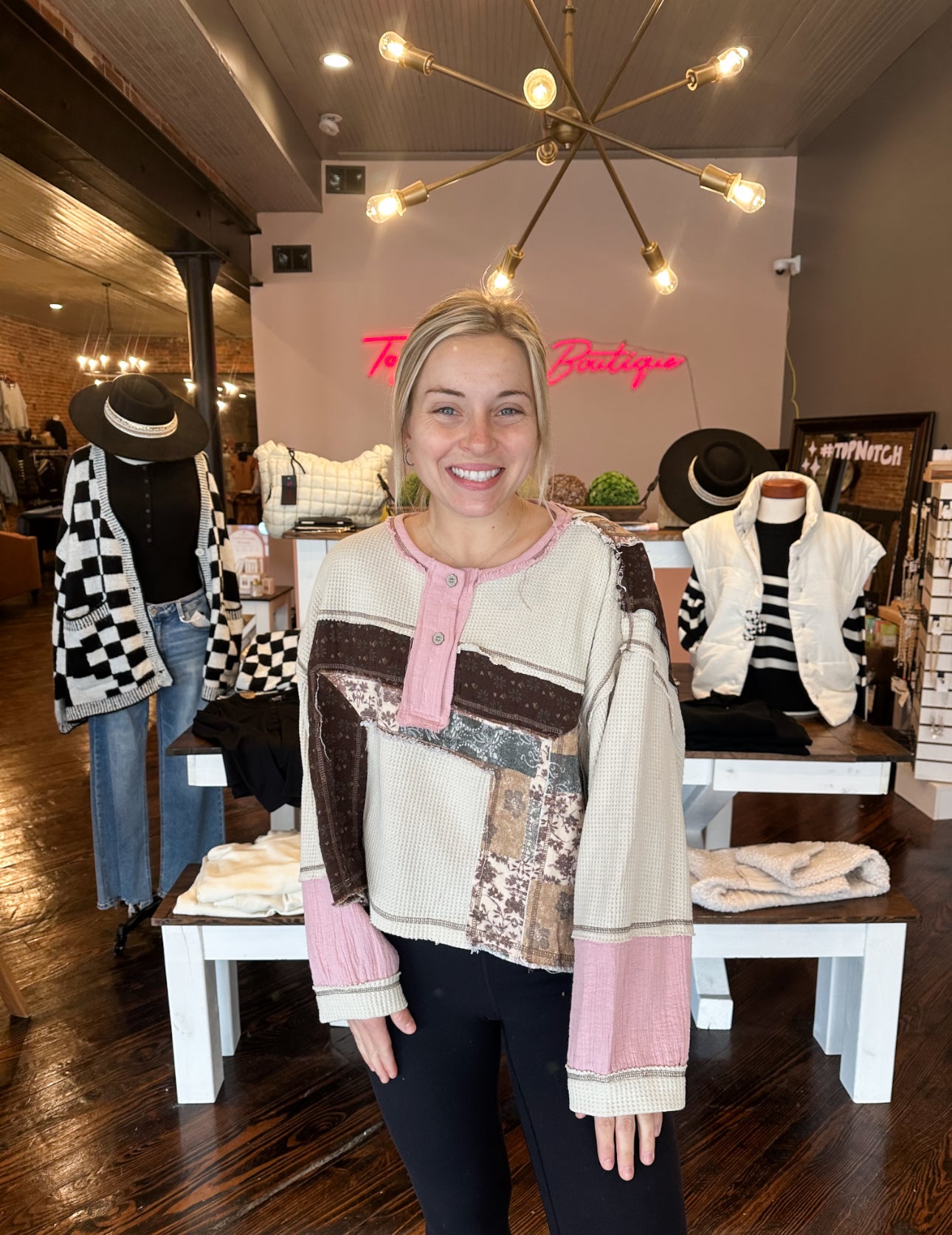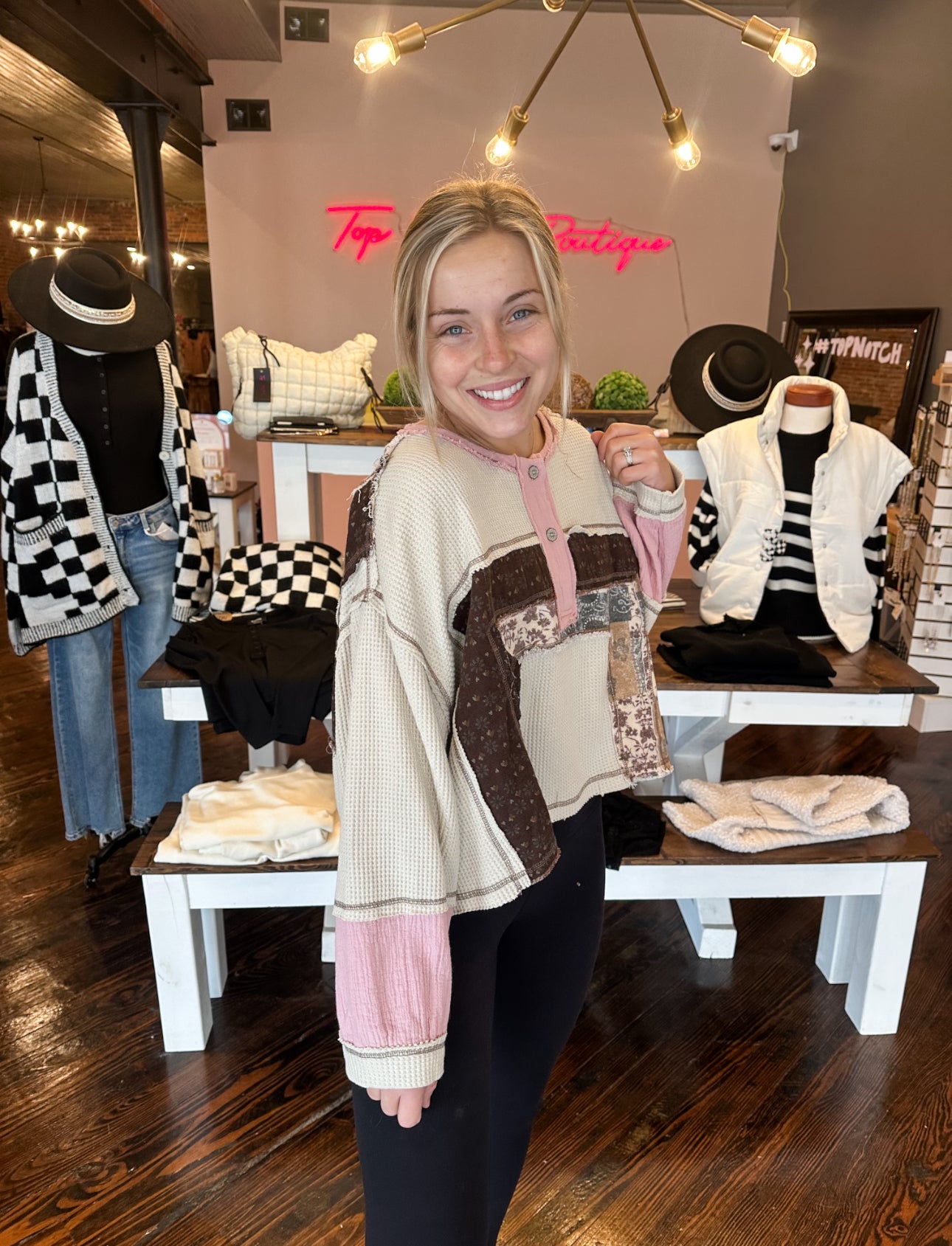 The POL Patterned Thermal Top features a soft waffle-knit base mixed with contrast patchwork panels, raw edge details, and a relaxed Henley neckline for that effortlessly worn-in look we love. The mix of textures and muted tones makes it a standout while still being easy to style.