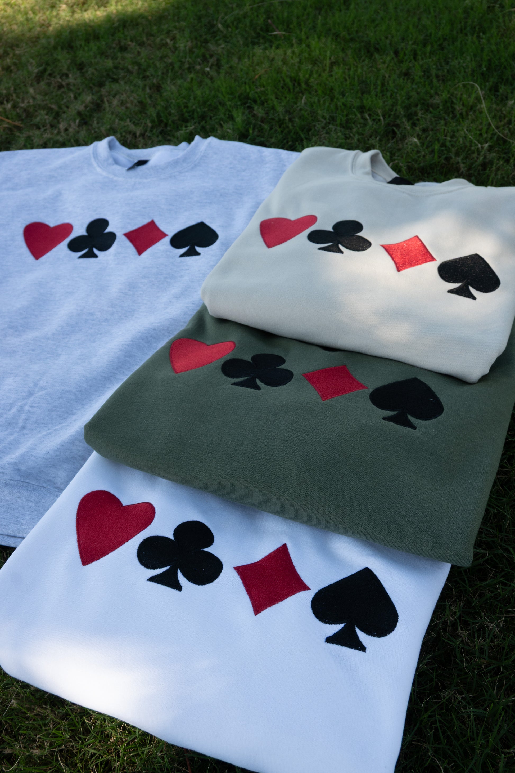 The Lucky Draw Embroidered Sweatshirt is a fun, playful take on a classic crewneck. Featuring bold embroidered card suit symbols across the chest, this sweatshirt brings lucky charm energy with an easy, everyday feel. Cozy enough for lounging, cute enough to style out — it’s a total standout.