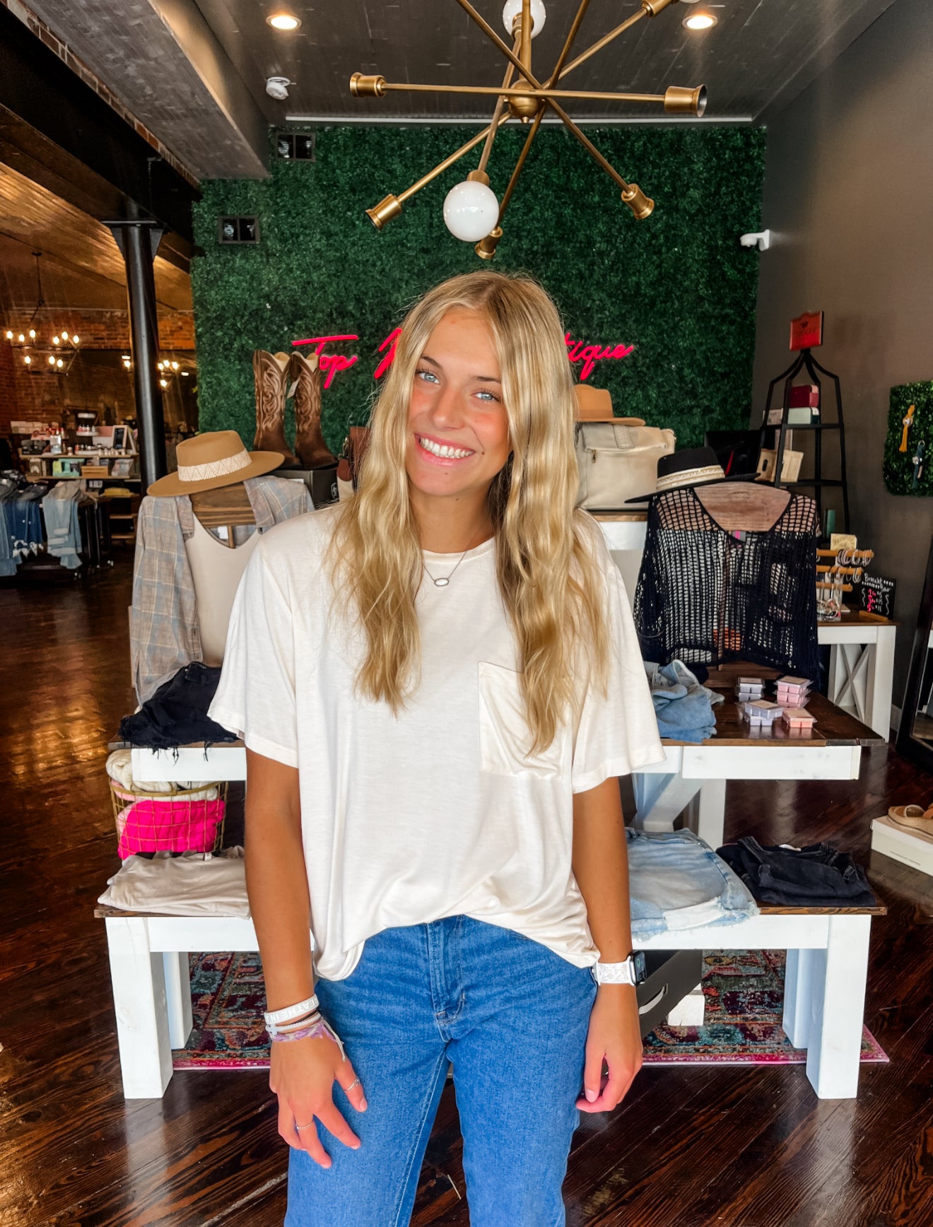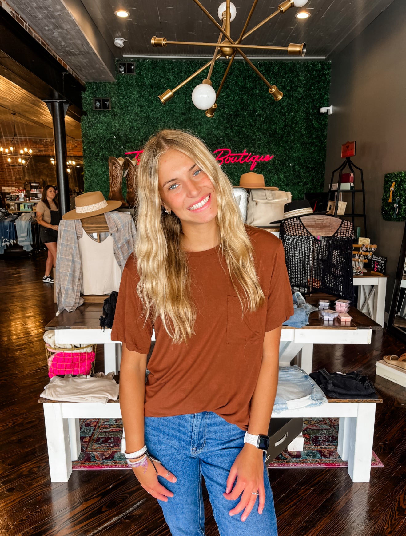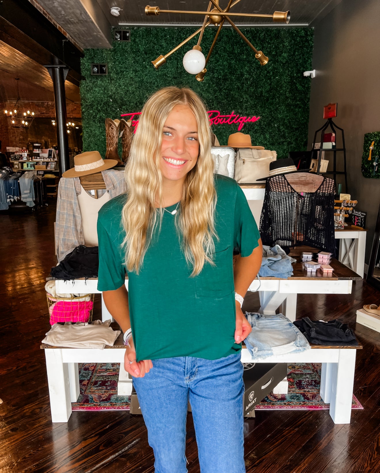 The ultimate everyday tee — soft, stretchy, and made to flatter. With its relaxed fit, pocket detail, and buttery rayon-blend fabric, this tee is one you’ll want in every color. Dress it up with a blazer or keep it casual with denim — either way, it’s a closet essential.