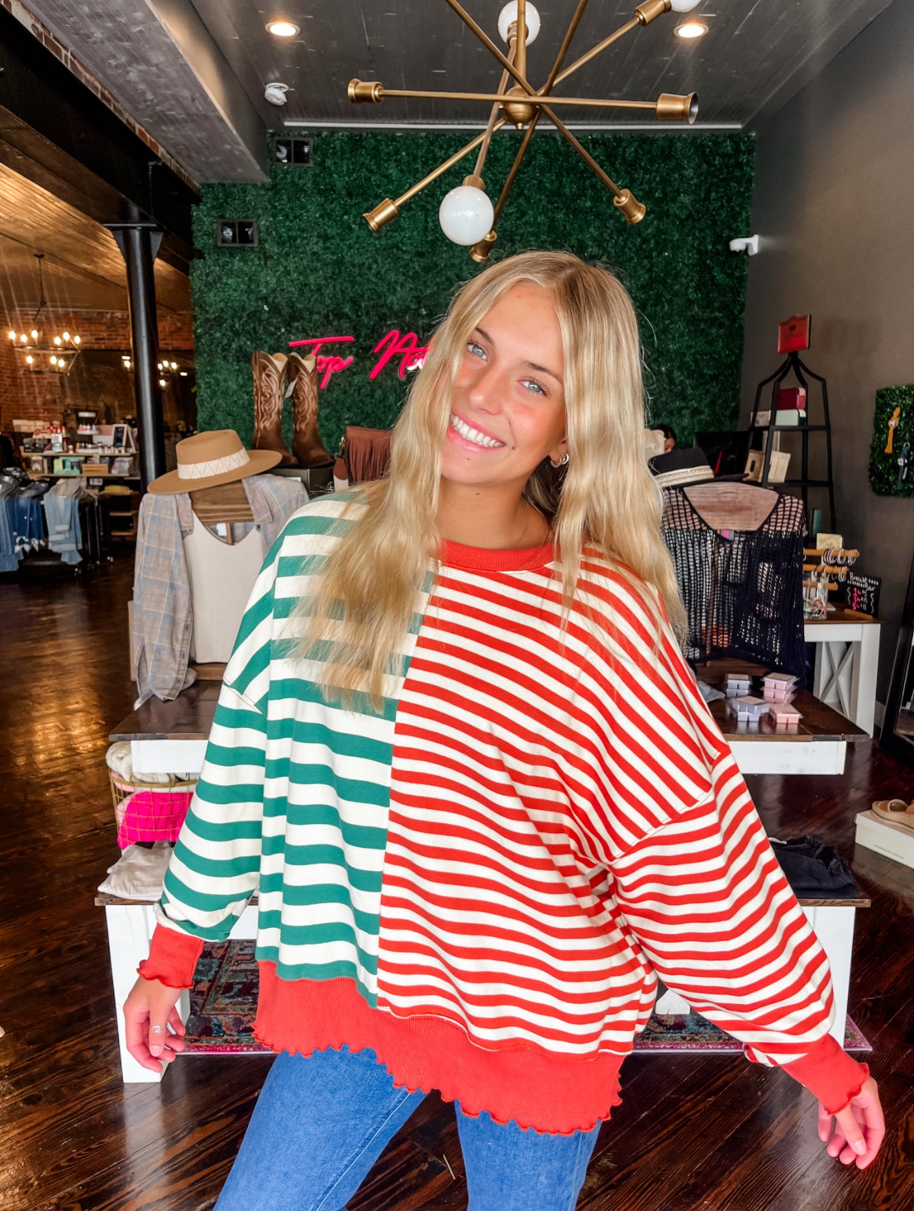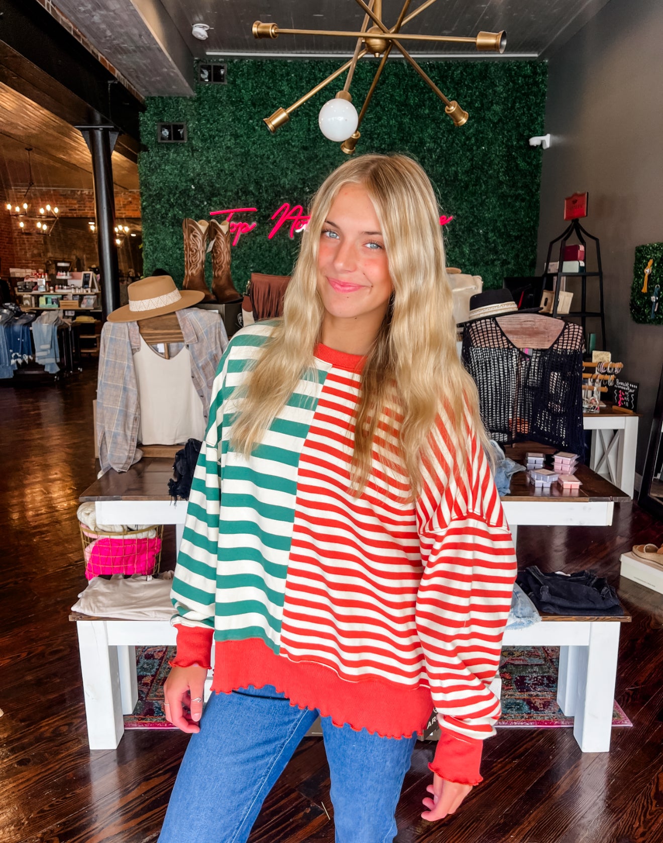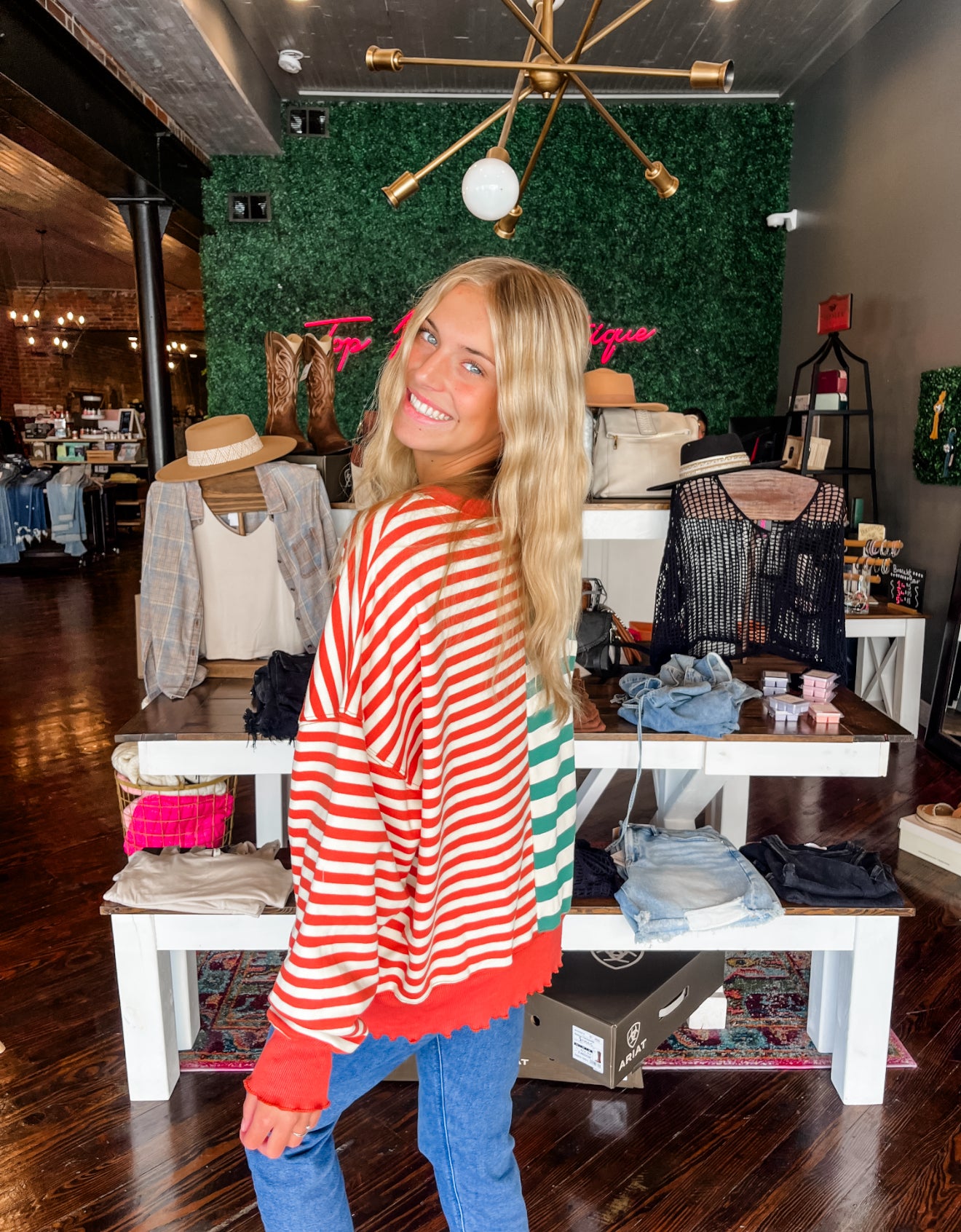 Bold, fun, and cozy — this striped pullover brings instant personality to your everyday look. With its color-block design, relaxed fit, and playful raw hem, it’s the perfect piece to throw on with jeans or leggings for an effortless outfit that still makes a statement.
