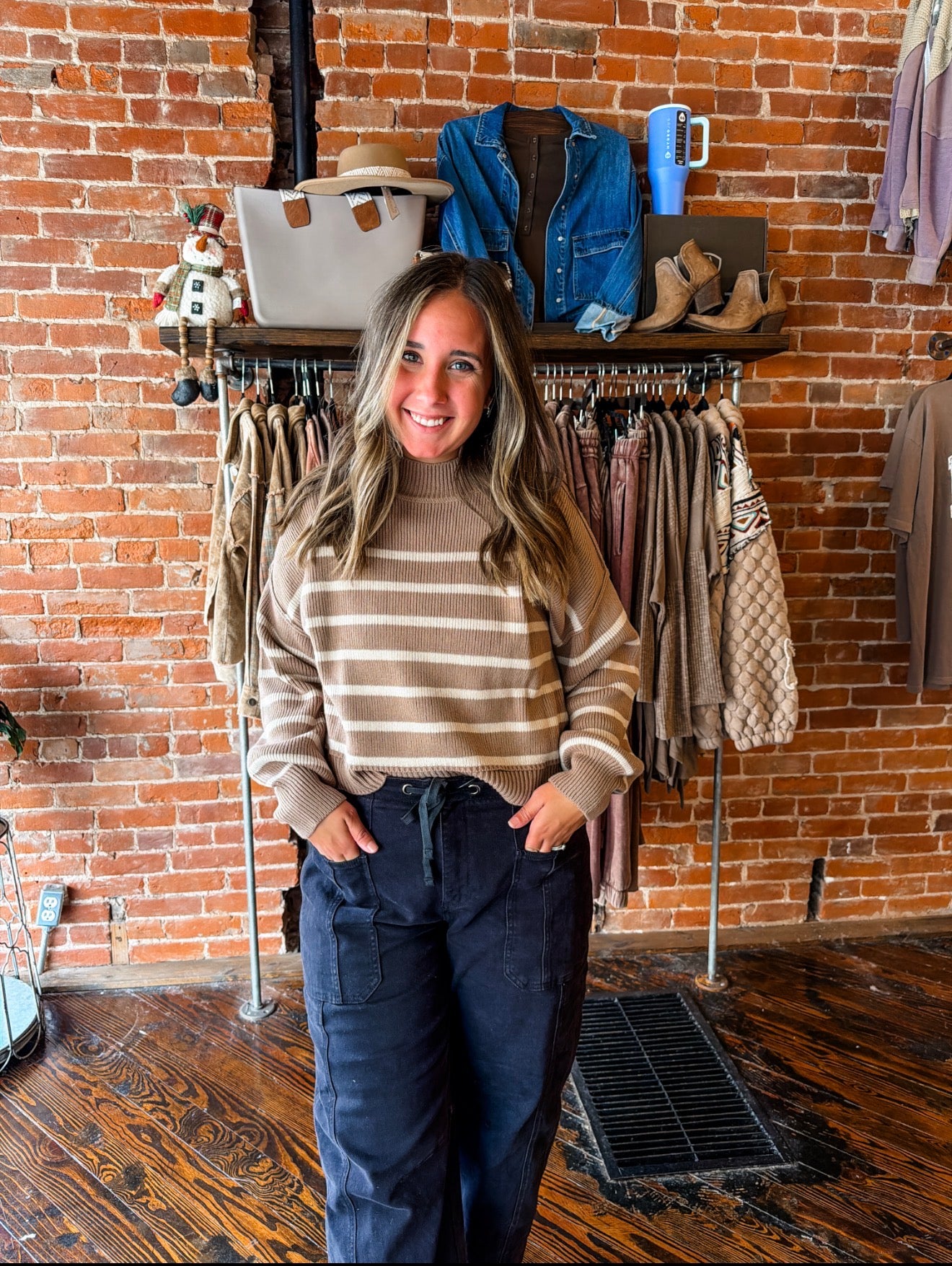 Start your day in comfort and style with the Morning Brew Sweater — a timeless striped knit in warm mocha and cream tones. Made from a soft cotton-blend fabric, this sweater has the perfect mix of structure and stretch for an easy, relaxed fit. Pair it with your favorite denim or layer it over a collared shirt for a cozy-chic fall look.
