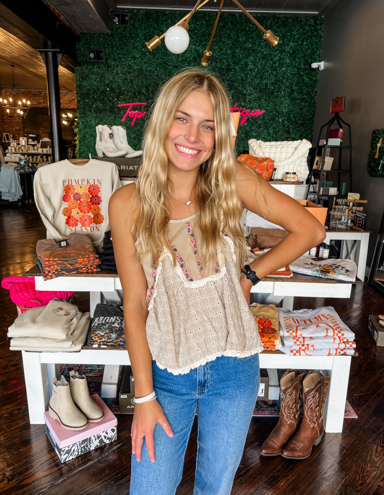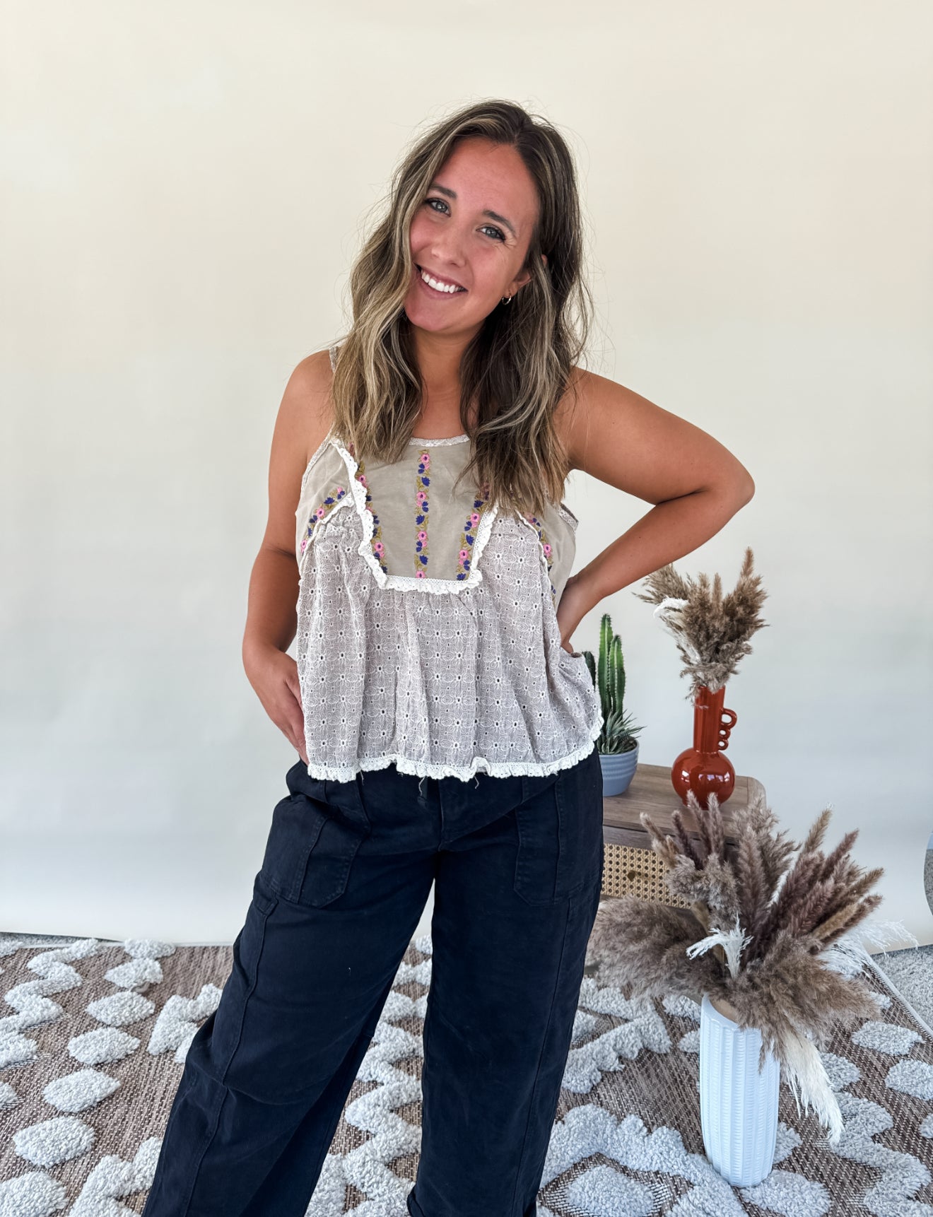 Sweet, feminine, and full of charm — the Petal Whisperer Tank is a must-have for your boho-inspired wardrobe. Made from 100% cotton, it features delicate eyelet lace detailing, embroidered floral accents, and a relaxed, flowy fit that’s perfect for layering or wearing on its own.