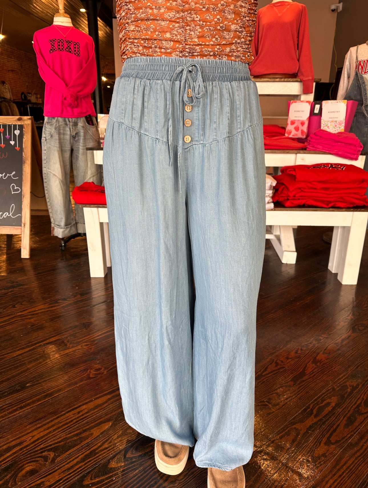 Easy, breezy, and made for everyday wear. These lightweight cotton wide-leg pants feature a relaxed fit with an elastic waistband and adjustable drawstring for all-day comfort. The soft chambray-style fabric drapes beautifully, while the button-front detail adds just the right touch of charm. Perfect for dressing up with a blouse or keeping casual with a tee.