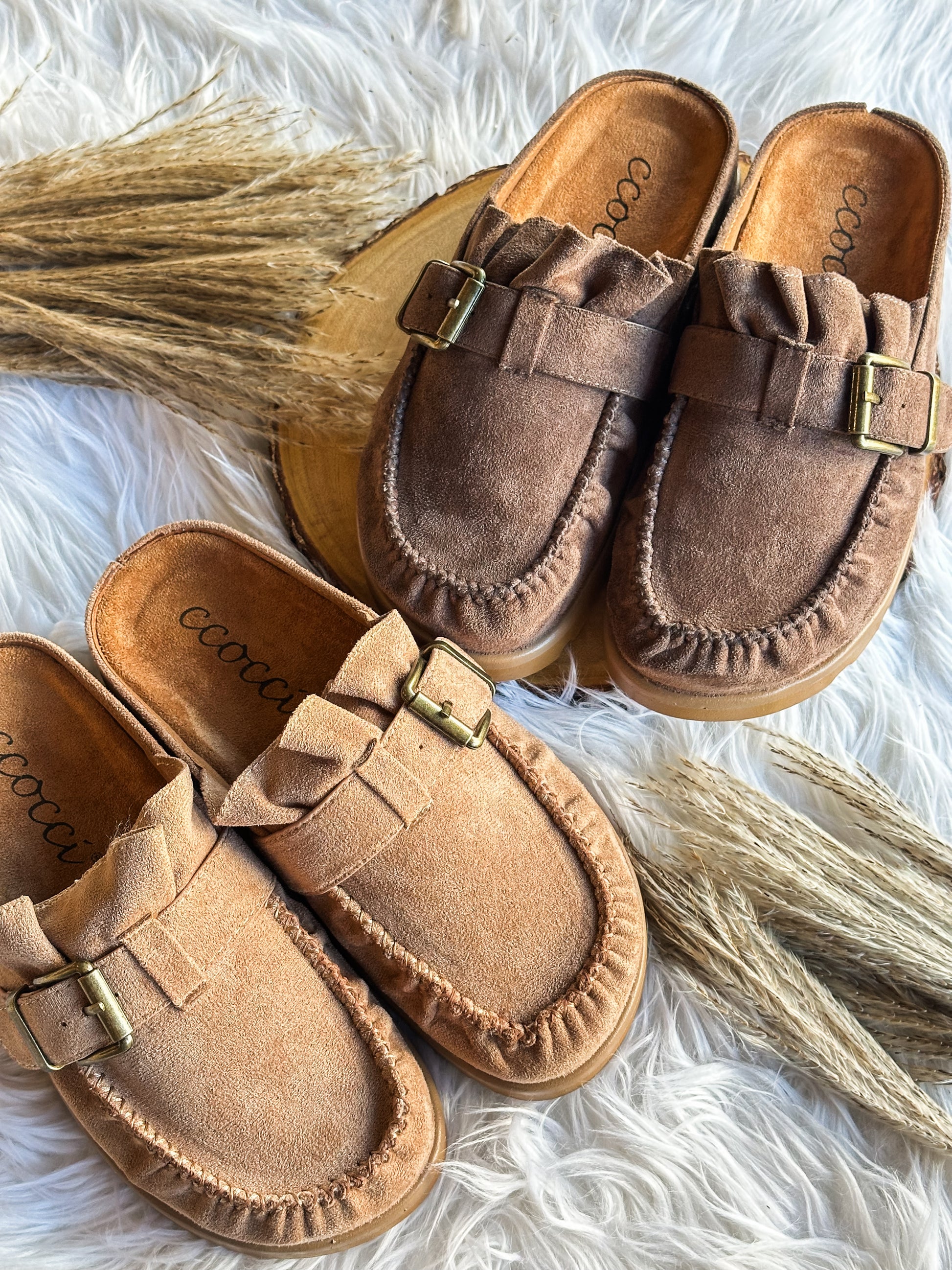 Featuring a soft faux-suede finish, delicate ruffle detailing, and a chic buckle strap — these slip-ons blend comfort and trend in the best way. Perfect for casual days out, running errands, or dressing up your denim for that cozy-yet-put-together look.