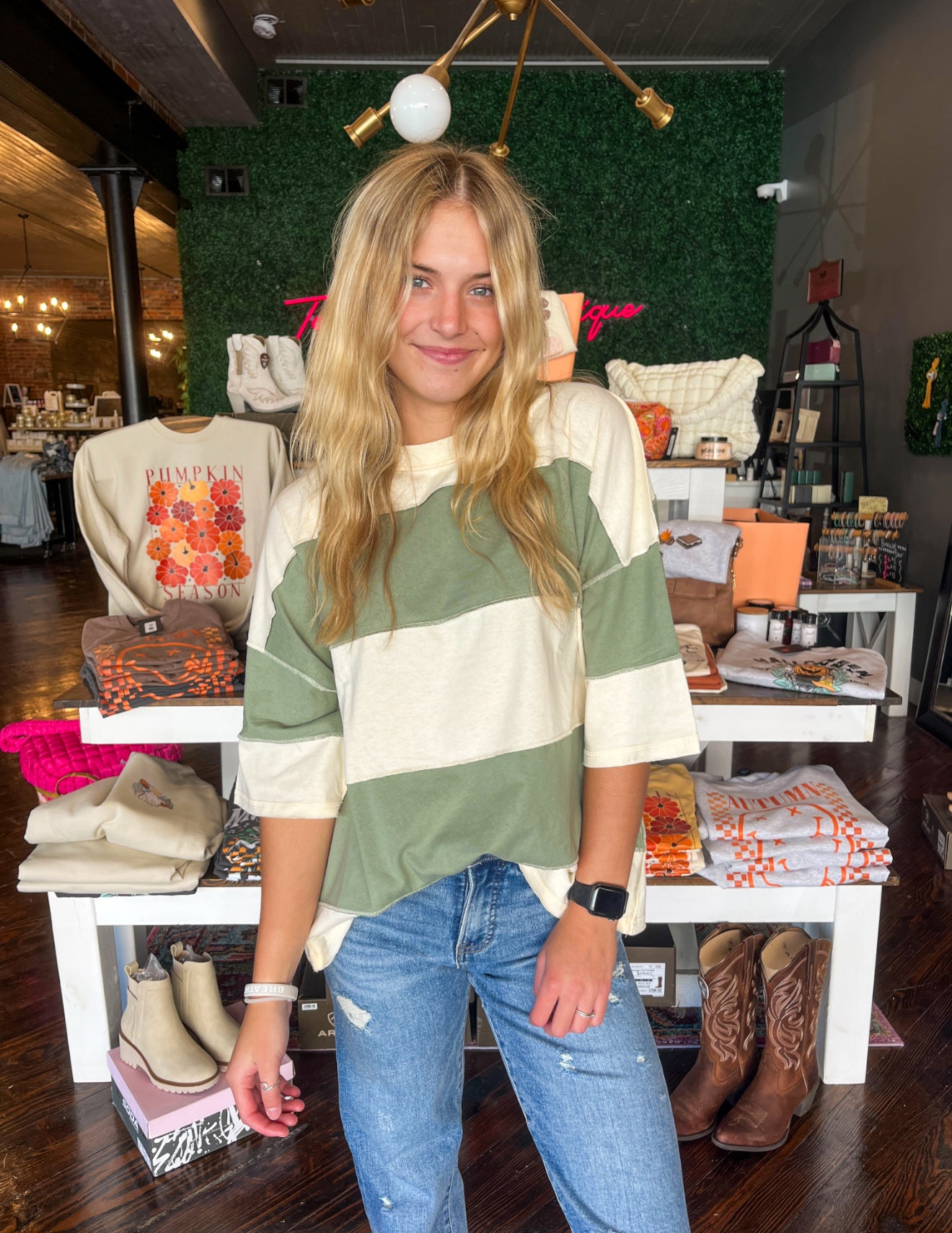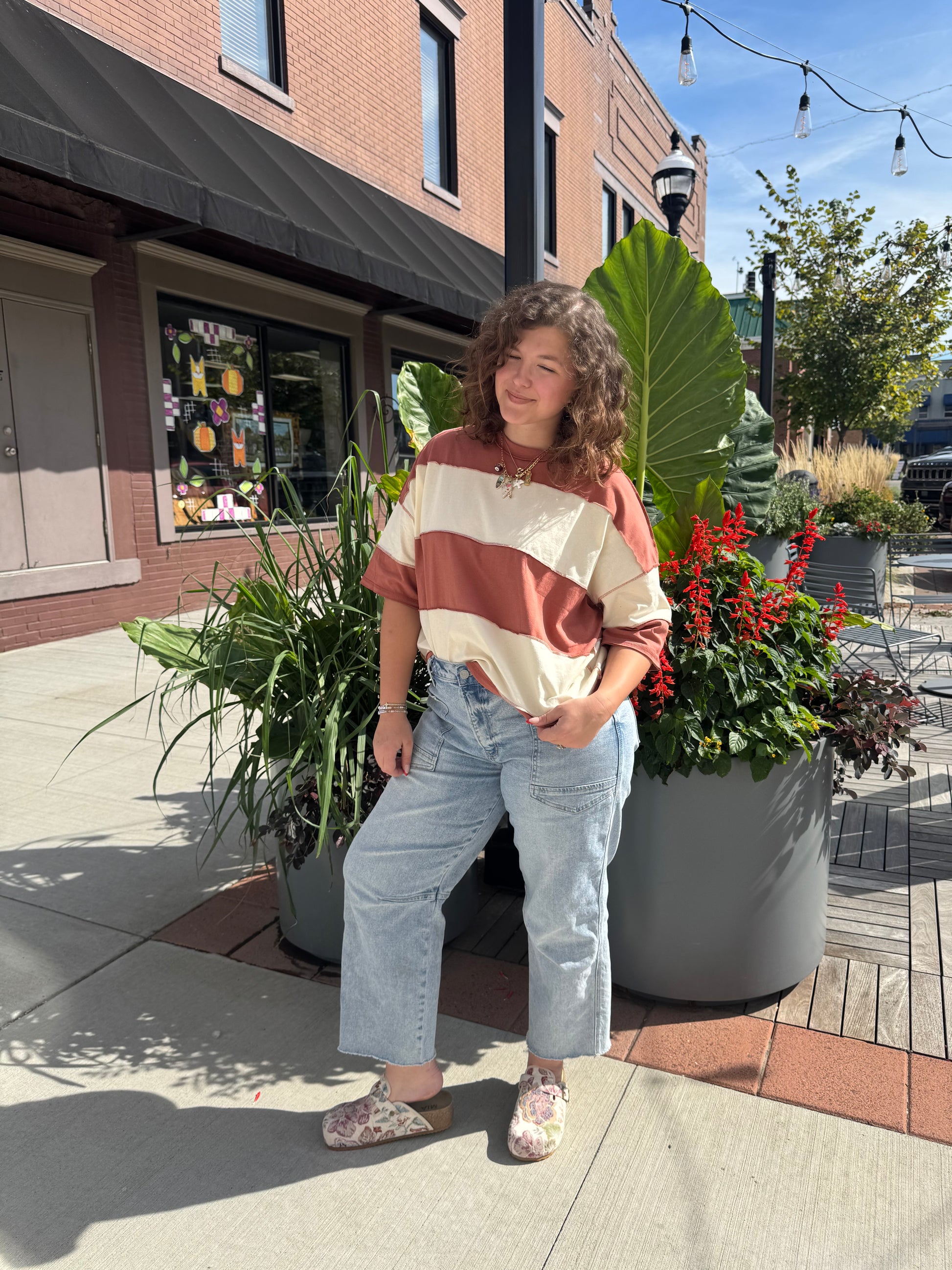 Effortless, comfy, and just the right amount of cool — the Urban Striped Tee is your new everyday favorite. This 100% cotton top features bold, wide stripes in soft neutral tones with an oversized fit that gives that relaxed, lived-in feel.