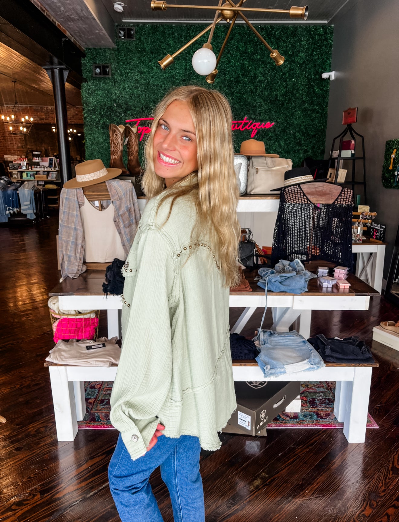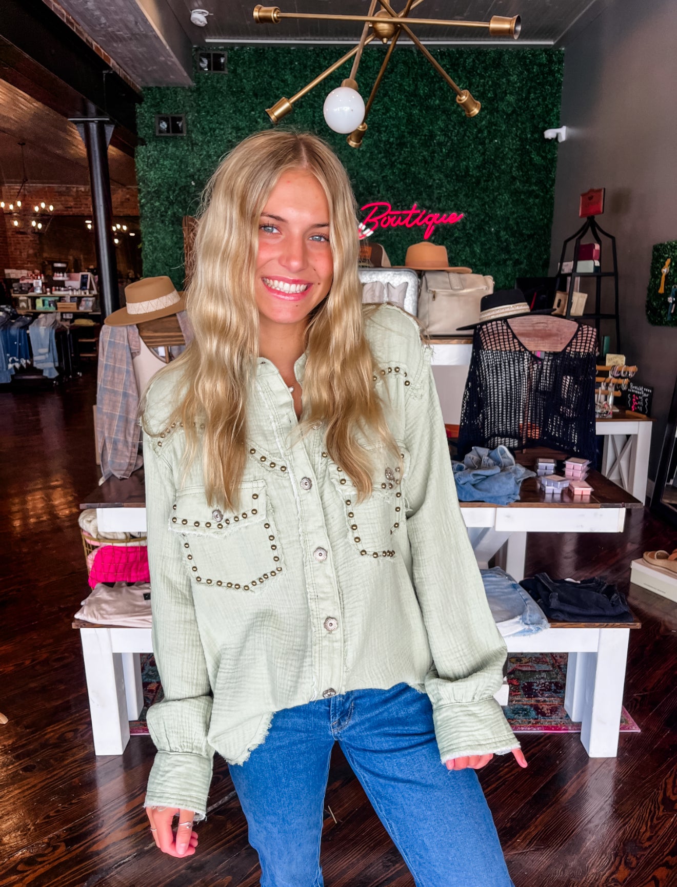 Your new everyday essential — this POL studded button-down shirt takes casual comfort and gives it a bold twist. Made from 100% cotton with a soft gauze texture, it’s lightweight, breathable, and detailed with antique-style studs for that perfect mix of relaxed and edgy. Wear it buttoned up, layered over a tank, or tied at the waist — it’s the piece you’ll style a dozen different ways.